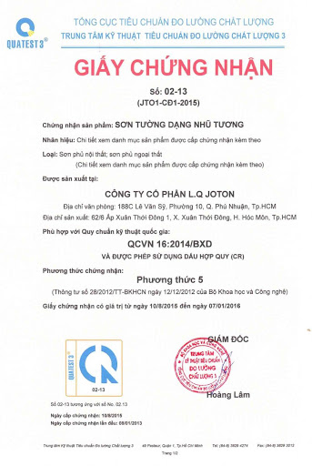 Giấy Chứng nhận Phù hợp Tiêu Chuẩn Kỹ Thuật Quốc Gia JOTON paint